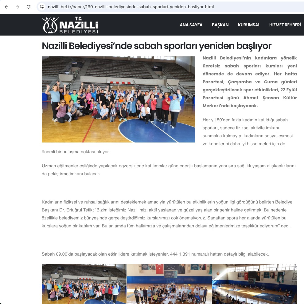 Nazilli Belediyesi’nin resmi sosyal medya hesabından yayımlanan bir haberde, “Nazilli Belediyesi’nin kadınlara yönelik ücretsiz sabah sporları kursları yeni dönemde de devam ediyor. Her hafta Pazartesi, Çarşamba ve Cuma günleri gerçekleştirilecek spor etkinlikleri, 22 Eylül Pazartesi günü Ahmet Şensan Kültür Merkezi’nde başlayacak” ifadeleri yer aldı.