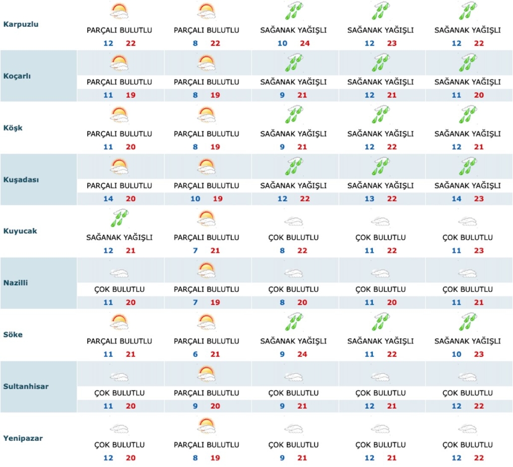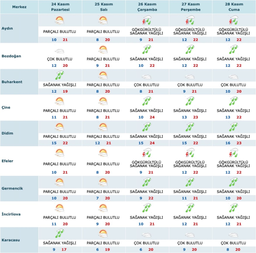 Yeni haftanın ilk gününde (24 Kasım) ‘Sağanak Yağışlı’ olması beklenen Buharkent, Karacasu ve Kuyucak ilçeleri hariç diğer ilçeler ‘Parçalı Bulutlu’ olacak. İkinci günde (25 Kasım) tüm ilçelerin ‘Parçalı Bulutlu’, 26-27-28 Kasım’da ise Buharkent, Karacasu, Kuyucak, Nazilli, Sultanhisar, Yenipazar’ın ‘Çok Bulutlu’; Bozdoğan, Çine, Didim, Efeler, Germencik, İncirliova, Karpuzlu, Koçarlı, Köşk, Kuşadası ve Söke’nin ‘Sağanak Yağışlı’ olacağı tahmin ediliyor.